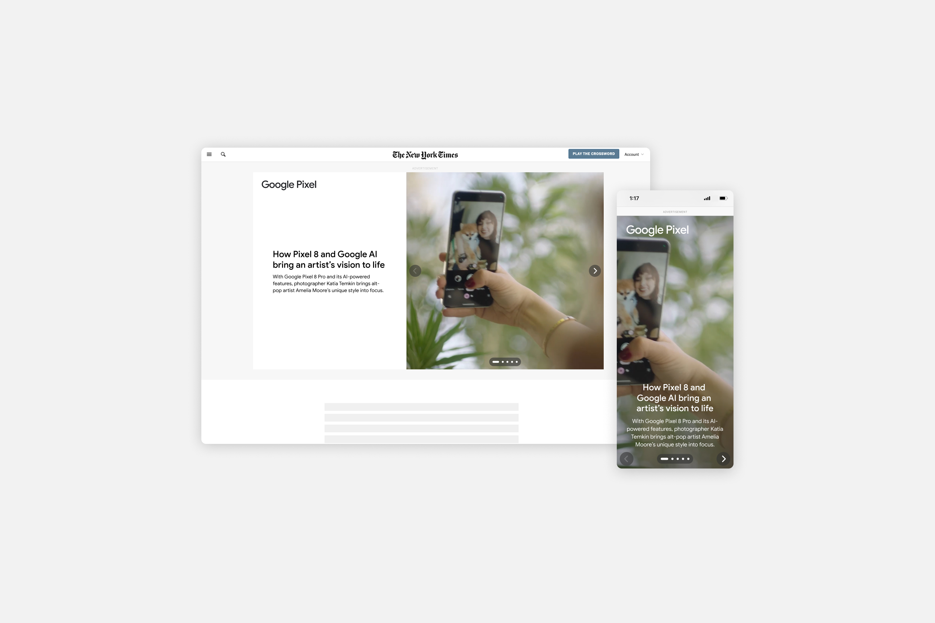 The New York Times has a series of proprietary ad units which we call Flex Frames. My team works on developing creative for these units and also designing new formats within the design system. Depending on whether the program is large or smaller I will work independently or on a team to develop these units and they will live in article or on section fronts. From interactive UI elements to art direction for creative I have a hand in creating the most custom ads on our platform.